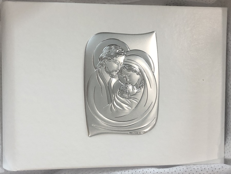Biały album na zdjęcia ze srebrnym obrazkiem z wizerunkiem Świętej Rodziny.