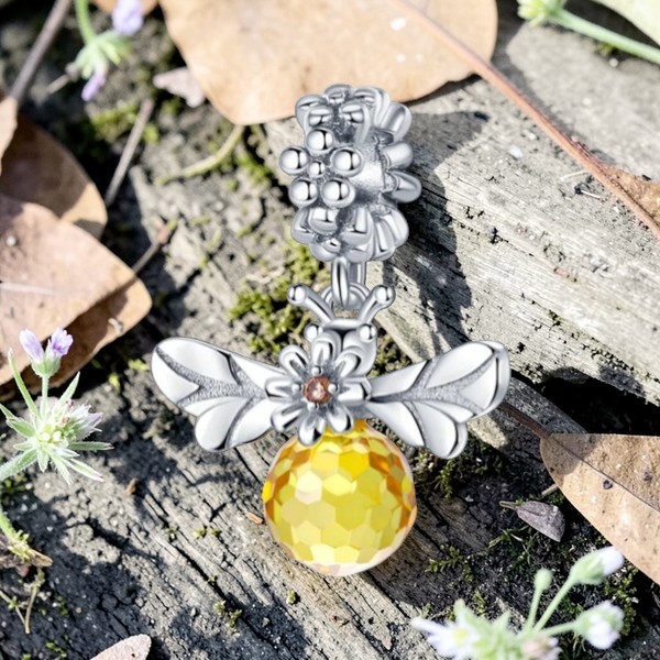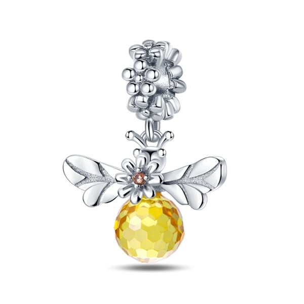 Charms wykonany z srebra rodowanego próby 925, przedstawia pszczołę w locie. Charakterystyczne skrzydła są precyzyjnie wykonane, centralna, żółta cyrkonia dodaje biżuterii życia i głębi, imitując miodowy bursztyn.