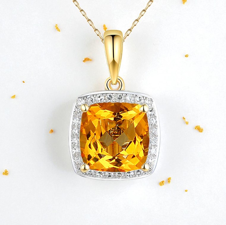 Zawieszka z żółtego złota ozdobiona pięknym naturalnym cytrynem i diamentami.