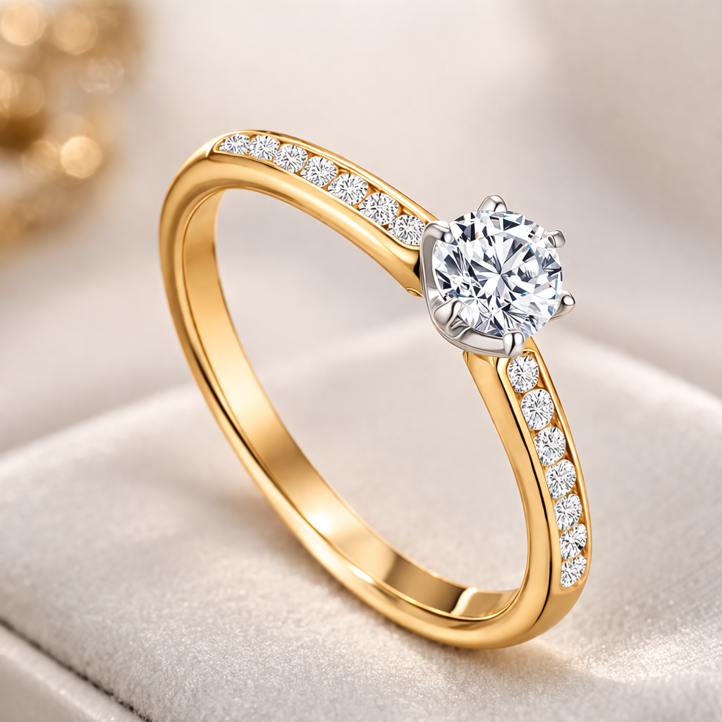 Elegancki pierścionek z żółtego złota próby Au 585 z efektownym diamentem laboratoryjnym o masie 1,00 ct w szlifie round brilliant. Szyna ozdobiona dodatkowymi diamentami (0,27 ct) subtelnie podkreśla blask kamienia głównego.