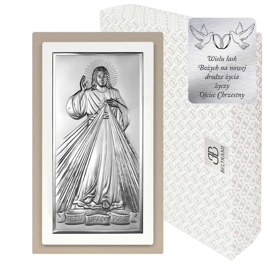 Srebrny obrazek z wizerunkiem Jezusa Miłosiernego oraz podpisem: "JEZU UFAM TOBIE"