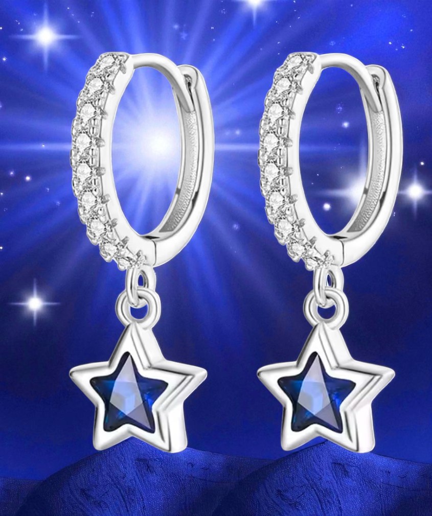 Eleganckie kolczyki wykonane ze srebra próby 925, pokrytego warstwą rodu dla pięknego blasku i ochrony przed ciemnieniem. Zdobione lśniącymi, białymi cyrkoniami umieszczonymi na obręczy oraz zawieszką w formie granatowej gwiazdki, która dodaje całości wyjątkowego charakteru. Stylowy i kobiecy model, idealny zarówno do codziennych stylizacji, jak i na wyjątkowe okazje.