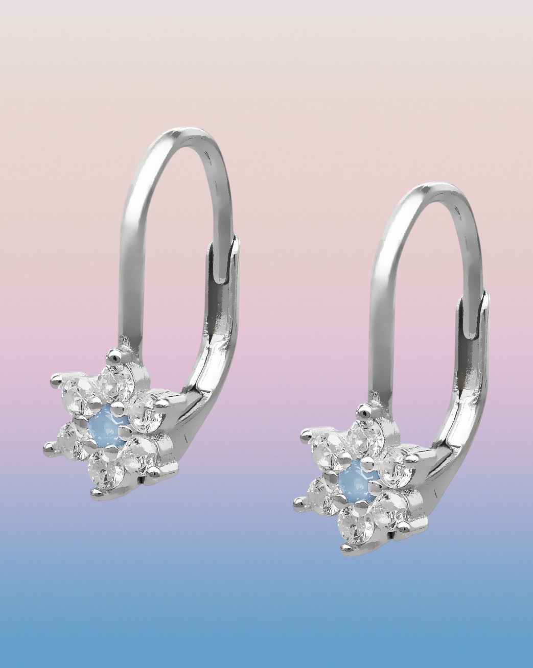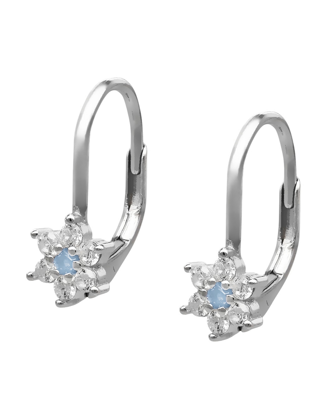 Kolczyki wykonane ze srebra rodowanego próby 925 z kwiatuszkami ozdobionymi białymi i niebieskimi cyrkoniami.