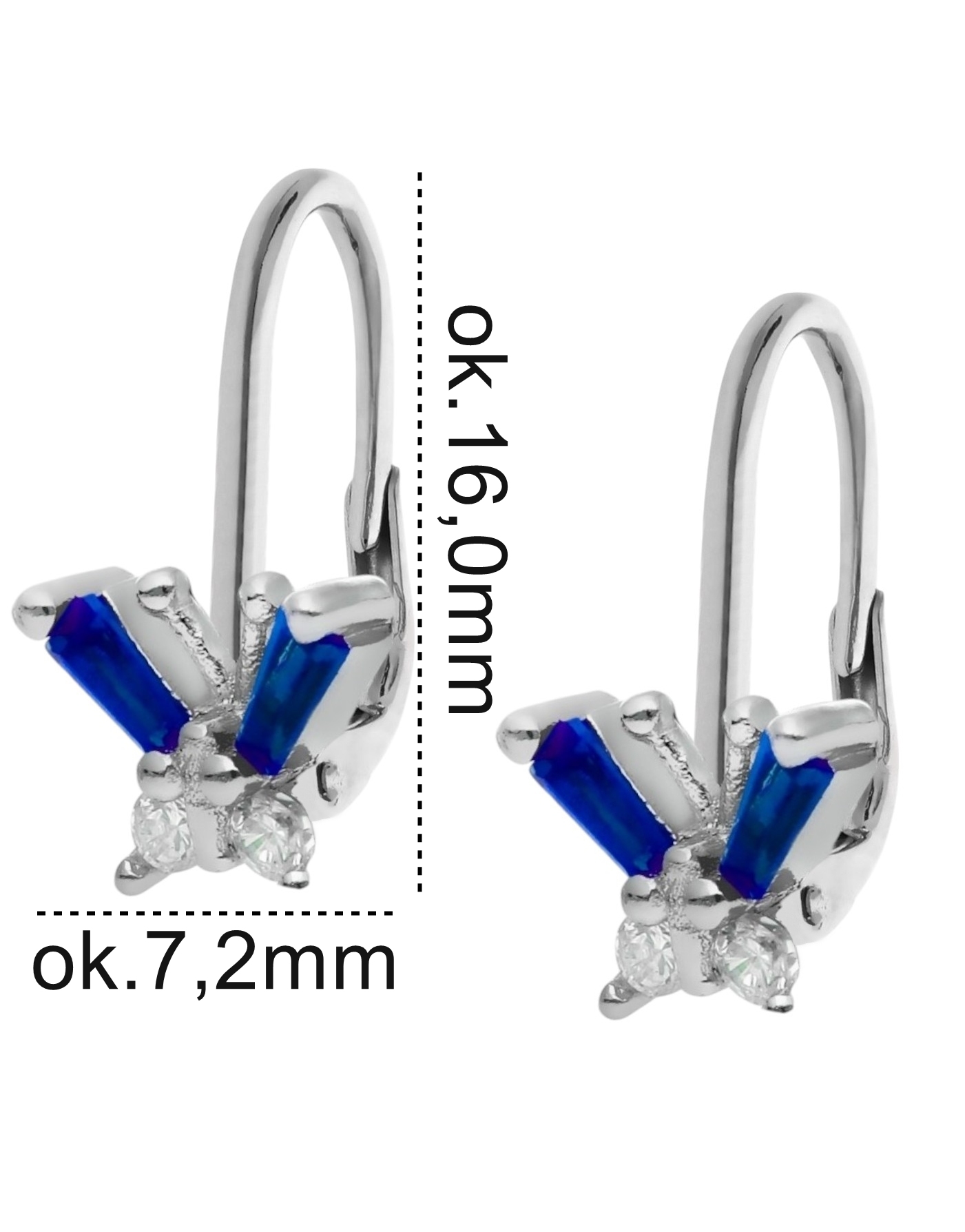 Urocze kolczyki wykonane ze srebra rodowanego próby 925, zachwycające delikatnym wzorem motylków. Skrzydełka ozdobiono lśniącymi cyrkoniami w kolorze niebieskim i białym, które pięknie odbijają światło i dodają biżuterii subtelnego blasku. Idealny wybór dla miłośniczek delikatnych, dziewczęcych dodatków oraz na prezent dla bliskiej osoby.