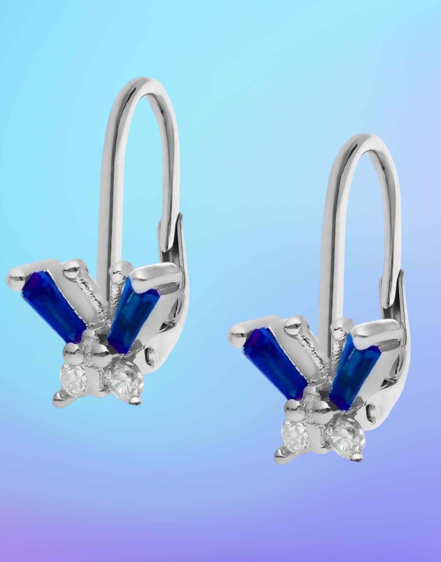 Kolczyki na biglu wykonane ze srebra rodowanego próby 925 z motylkami ozdobionymi białymi i niebieskimi cyrkoniami.