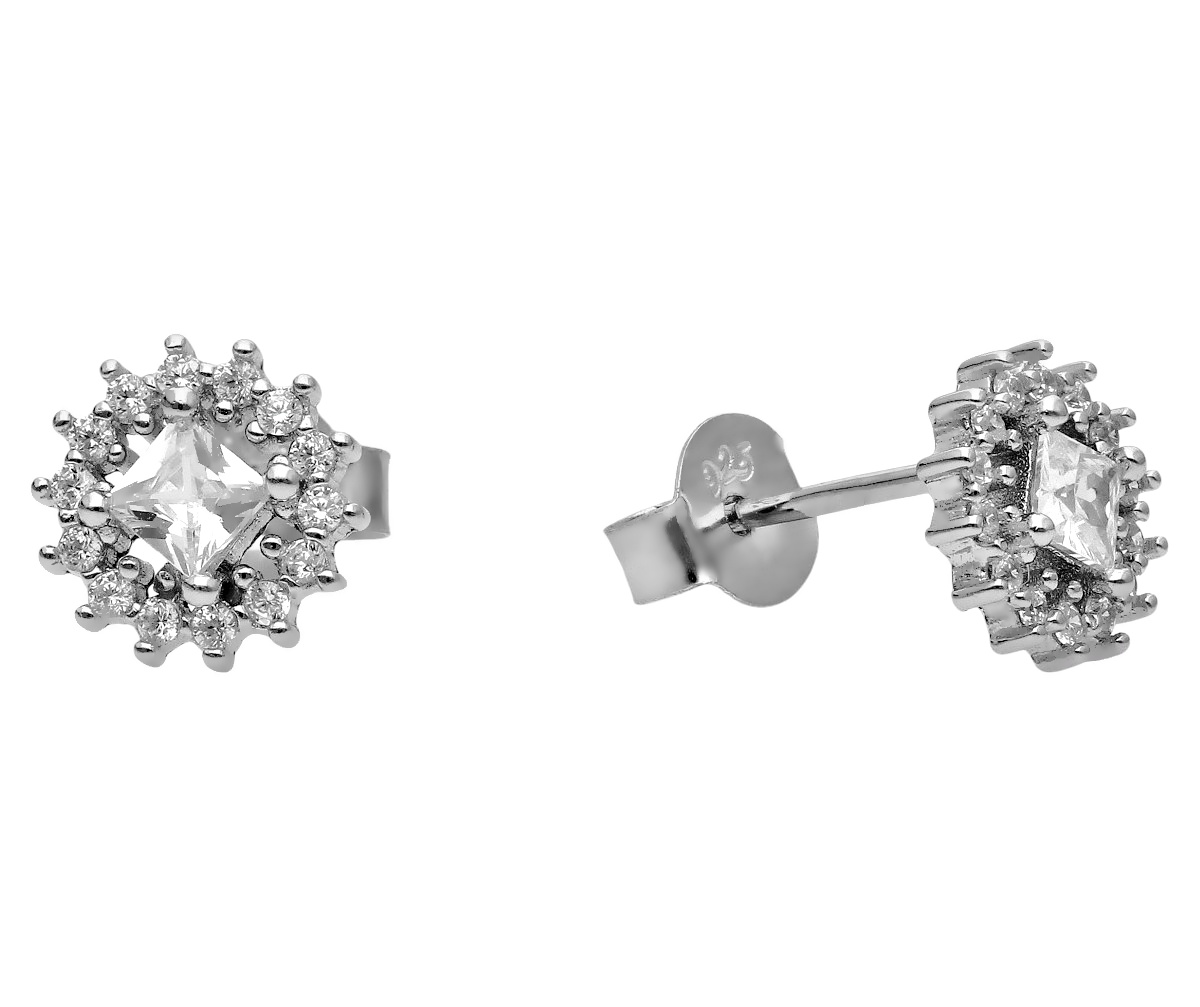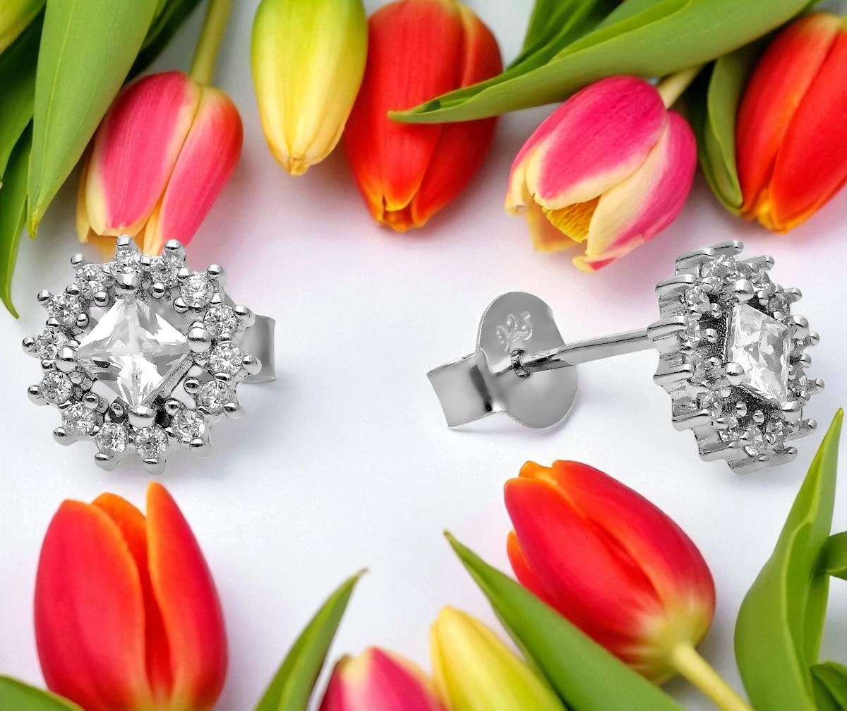 Eleganckie kolczyki na sztyfcie, wykonane z wysokiej jakości srebra próby 925 pokrytego warstwą rodu. Centralna, większa cyrkonia w szlifie kwadratowym otoczona jest mniejszymi, lśniącymi kamieniami, które tworzą efektowną kompozycję pełną blasku. Rodowanie zabezpiecza srebro przed ciemnieniem i nadaje mu luksusowy połysk.
