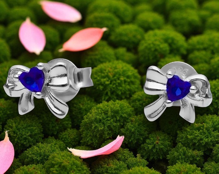 Urocze kolczyki w kształcie kokardek, ozdobione błyszczącymi niebieskimi cyrkoniami w formie serduszek. Wykonane ze srebra rodowanego próby 925, które zachowuje swój połysk i odporność na ciemnienie. Subtelny i dziewczęcy wzór sprawia, że kolczyki doskonale pasują zarówno do codziennych stylizacji, jak i na wyjątkowe okazje.