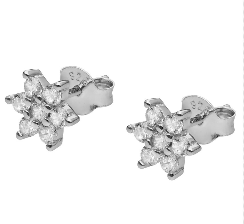 Kolczyki na sztyfcie wykonane ze srebra rodowanego próby 925 z kwiatuszkami ozdobionymi białymi cyrkoniami.