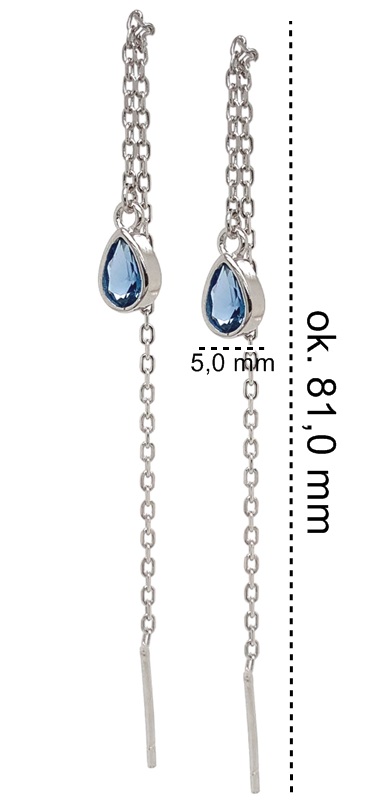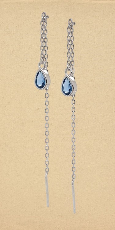 Srebrne kolczyki przeciągane z niebieską cyrkonią w kształcie łezki. Kolczyki mają elegancki i nowoczesny wygląd, a ich konstrukcja sugeruje, że podczas noszenia zwisają i poruszają się z wdziękiem. Wykonany z najwyższej jakości sreba rodownego próby 925.
