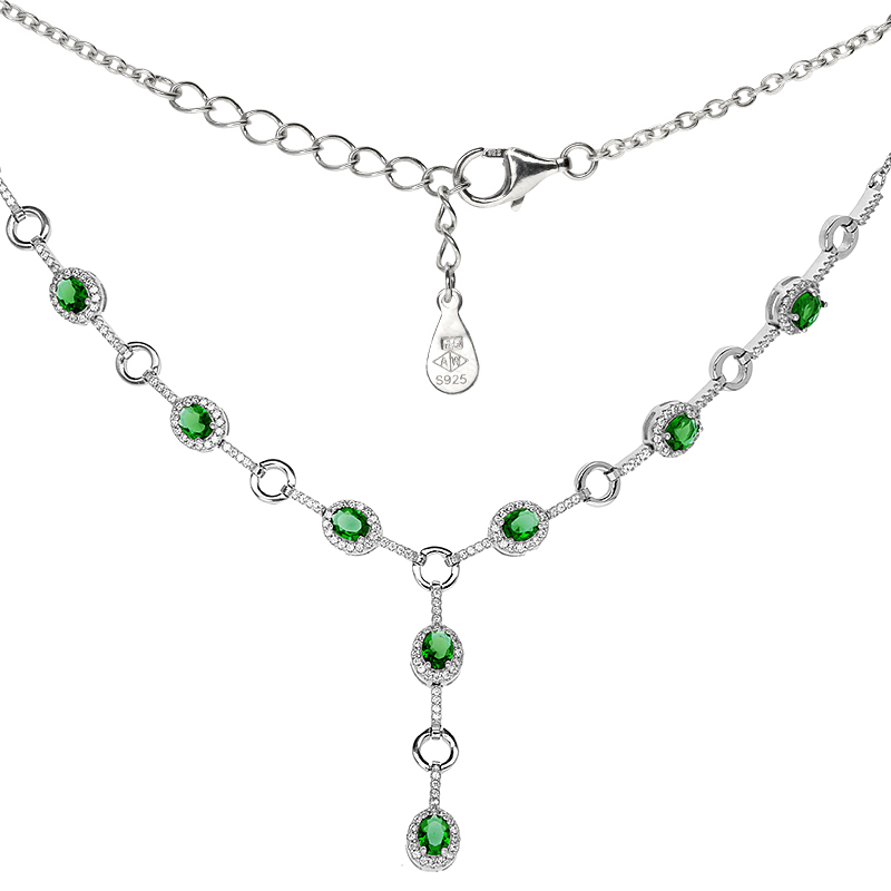 Srebrny naszyjnik rodowany Ag 925 z srebrnymi kółeczkami i zieloną cyrkonią, obsadzoną białymi cyrkoniami. Zapięcie karabińczyk.