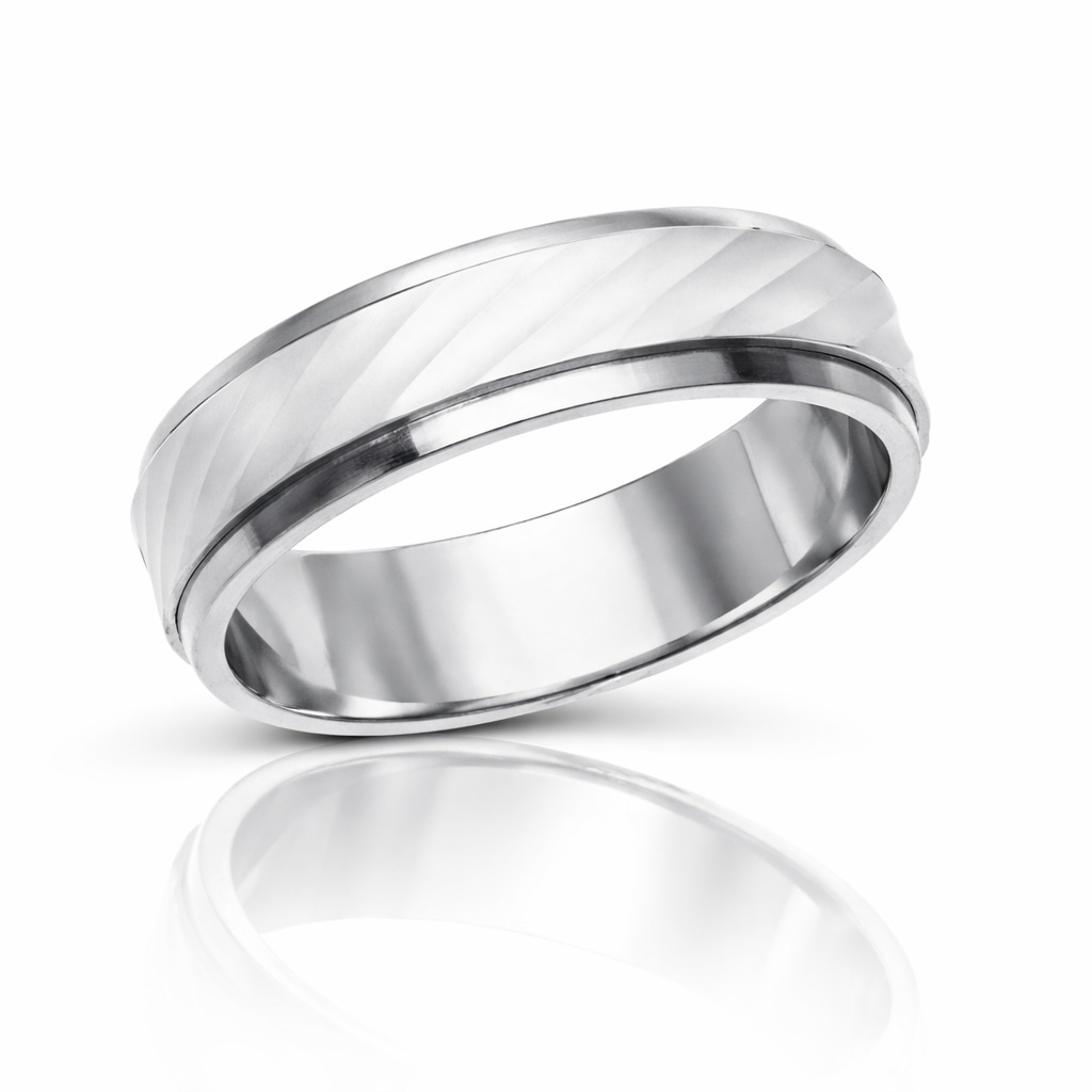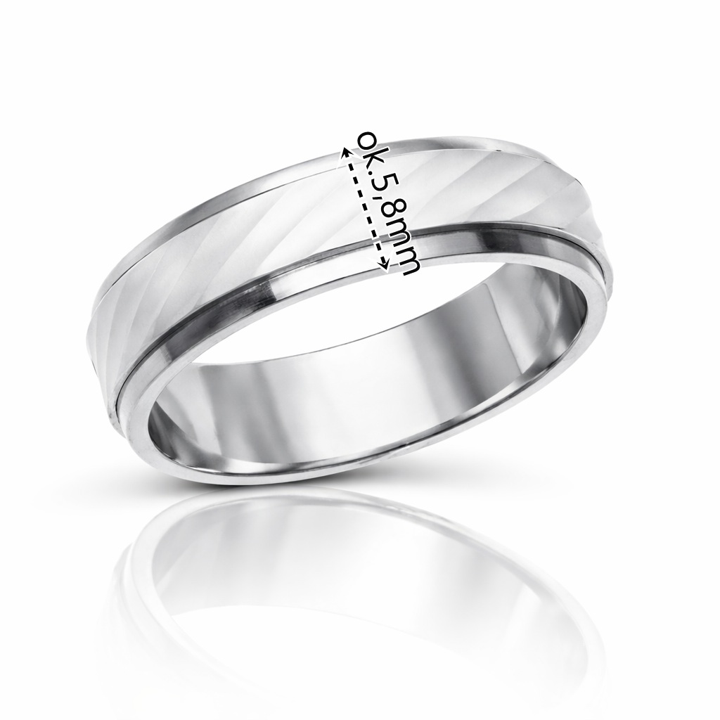 Nowoczesna obrączka obrotowa wykonana z rodowanego srebra próby 925. Model o szerokości 5,8 mm i wysokości 1,6 mm, wykończony w eleganckim połysku z dekoracyjną, obrotową częścią. Obrączka wykonana w technologii bezszwowej (bez lutowania), co zapewnia trwałość i estetyczne wykończenie.