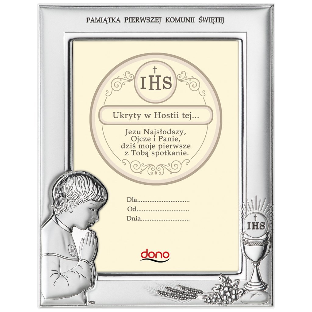 Ramka srebrna z podpisem: "PAMIĄTKA PIERWSZEJ KOMUNII ŚWIĘTEJ" z wizerunkiem modlącego się chłopca oraz kielicha z Hostią.