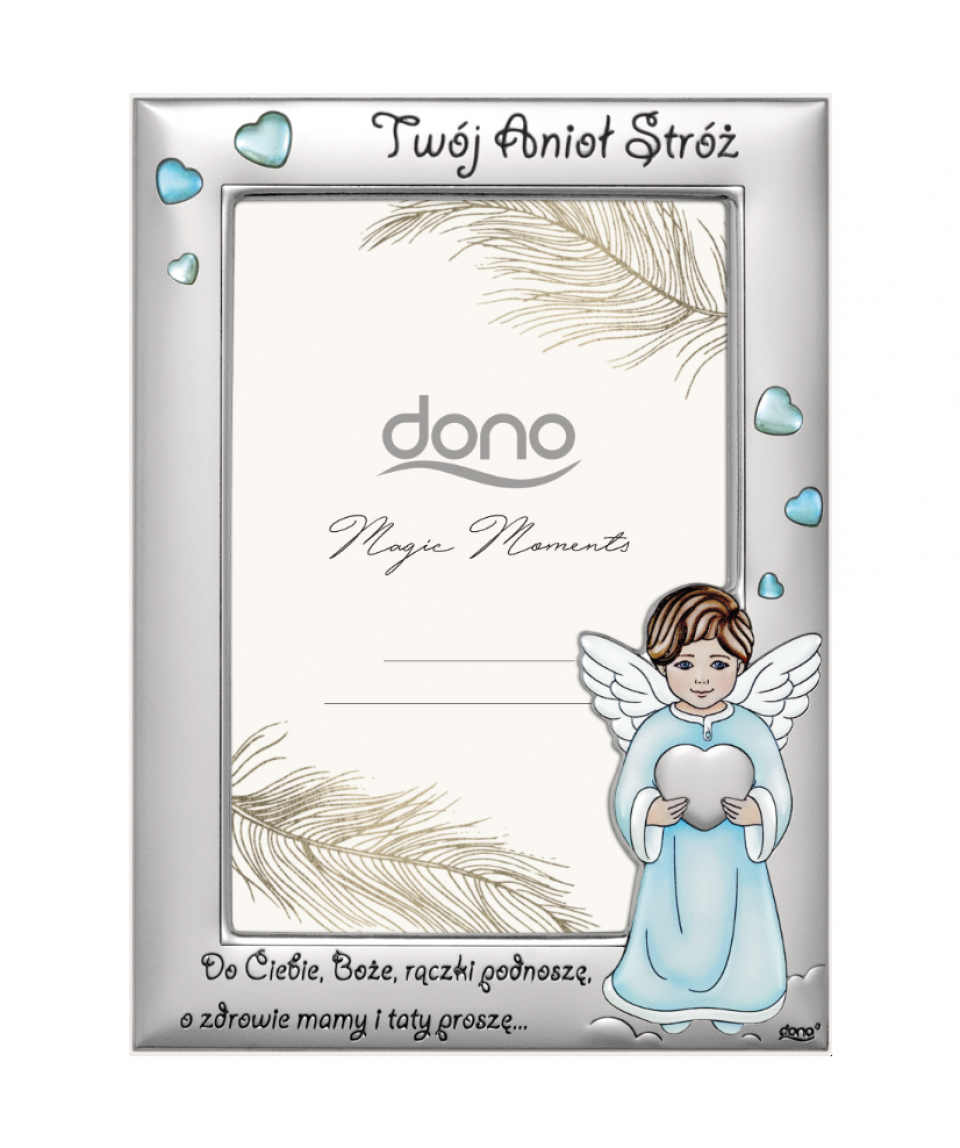 Ramka srebrna, niebieska Twój Anioł Stróż z modlitwą za Rodziców: Do Ciebie, Boże, rączki podnoszę, o zdrowie mamy i taty proszę...
