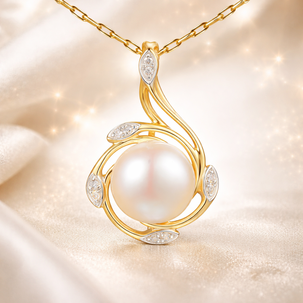 Perła została otoczona finezyjną, złotą oprawą o lekkiej i nowoczesnej formie, która nadaje zawieszce wyjątkowej lekkości i elegancji. Kompozycję dopełniają diamenty o łącznej masie 0,04 ct w szlifie SCD, które subtelnie rozświetlają całość i pięknie podkreślają naturalny blask perły.