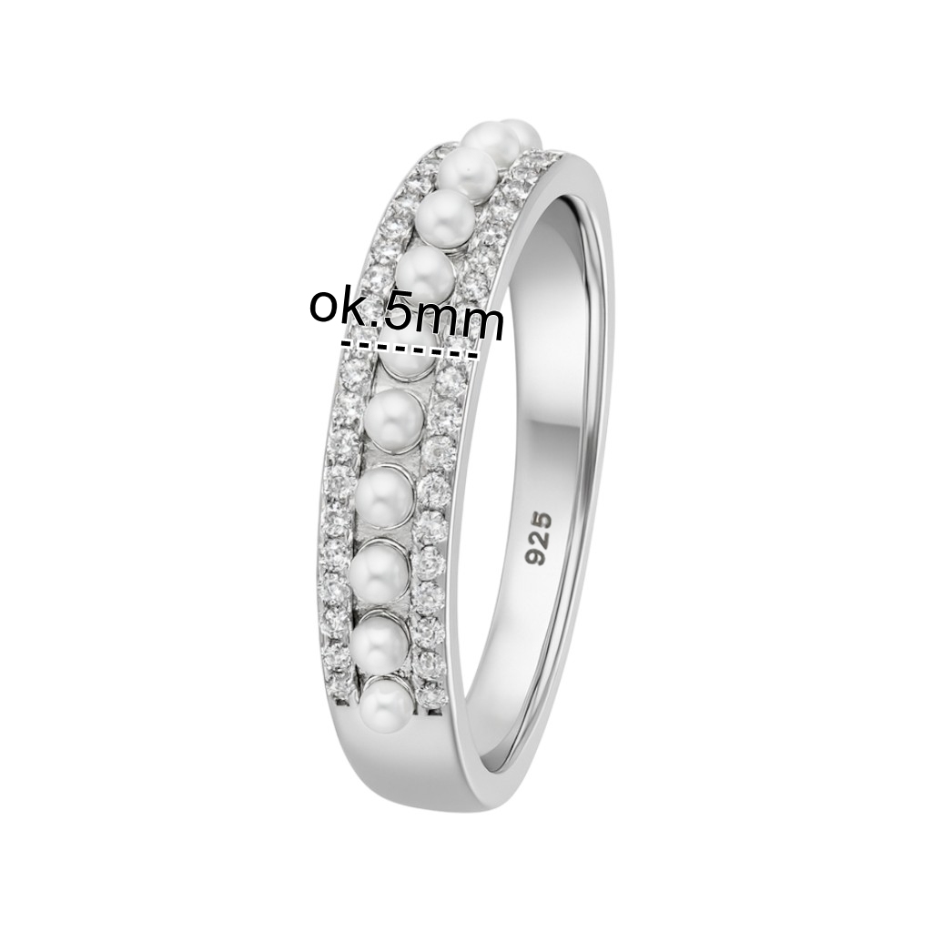 Wyjątkowy pierścionek wykonany z wysokiej jakości, rodowanego srebra próby 925, który zachwyca elegancją i subtelnym blaskiem. Jego powierzchnię zdobi rząd drobnych białych perełek, otoczonych lśniącymi cyrkoniami, tworząc harmonijną i niezwykle kobiecą kompozycję. Precyzyjne wykonanie oraz delikatny połysk srebra podkreślają klasyczny charakter biżuterii.