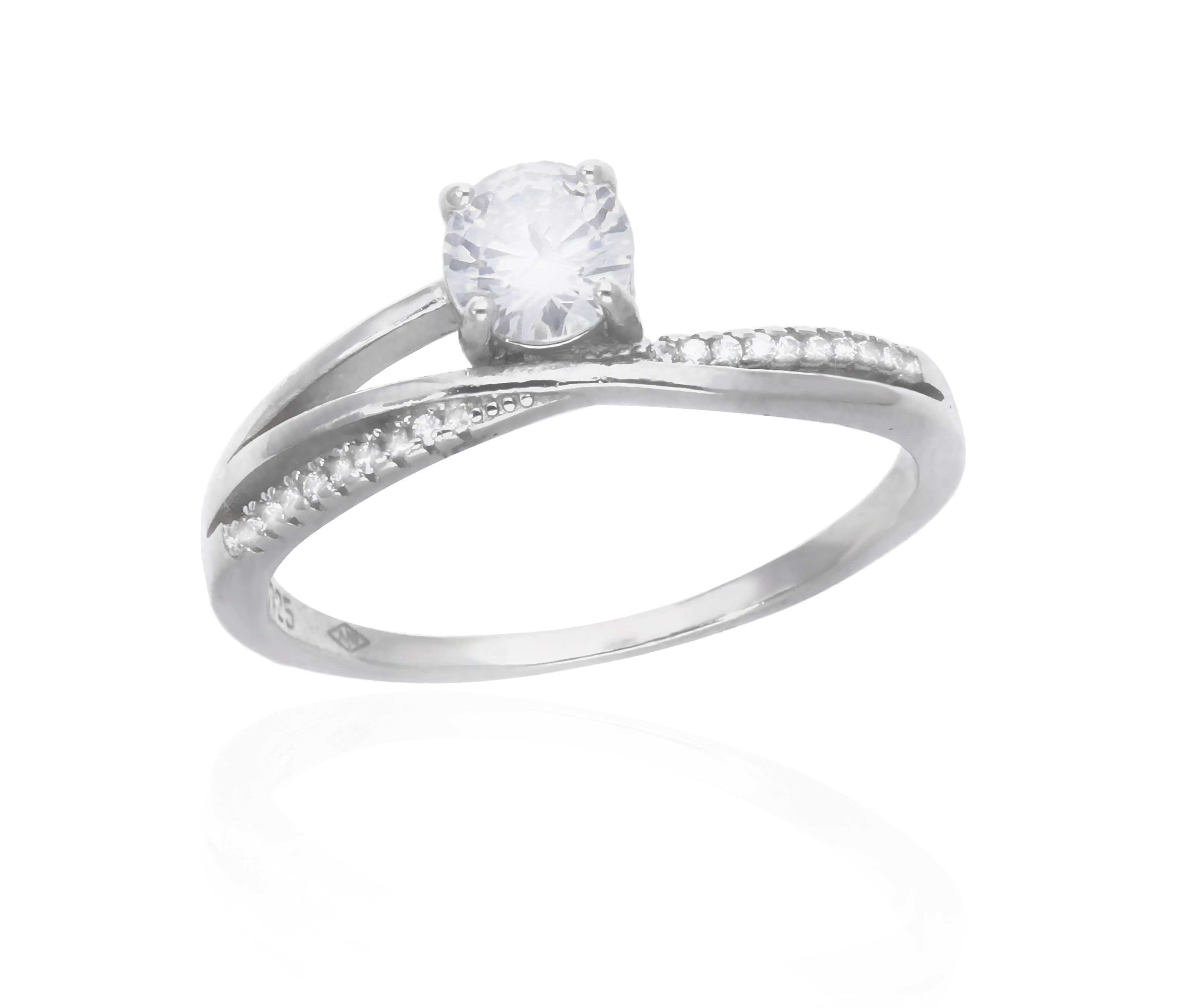 Srebrny pierścionek rodowany z dużą cyrkonią oraz ozdobną obrączką. Do produkcji użyto srebra próby 925.
