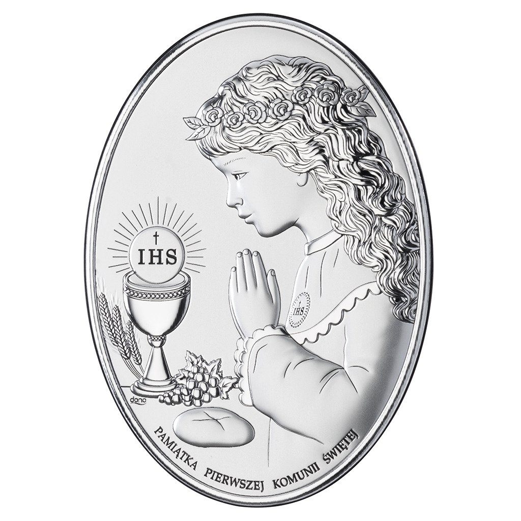 Obrazek srebrny Pamiątka Pierwszej Komunii Świętej z wizerunkiem modlącej się dziewczynki