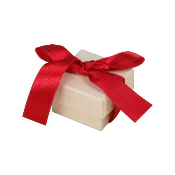 Eleganckie opakowanie papierowe na biżuterię w kolorze ecru przewiązane czerwoną kokardą.