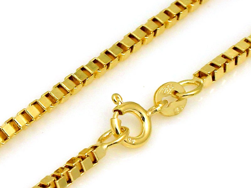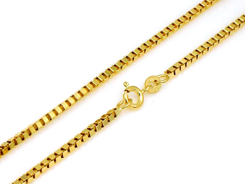 Złoty łańcuszek o splocie typu kostka. Łańcuch składa się z prostokątnych ogniw, które są ułożone tak, aby przypominały kształt kostek.Ogniwa są dość masywne i mają wyraźnie zaznaczone krawędzie, co nadaje łańcuszkowi wyjątkową teksturę i wygląd.