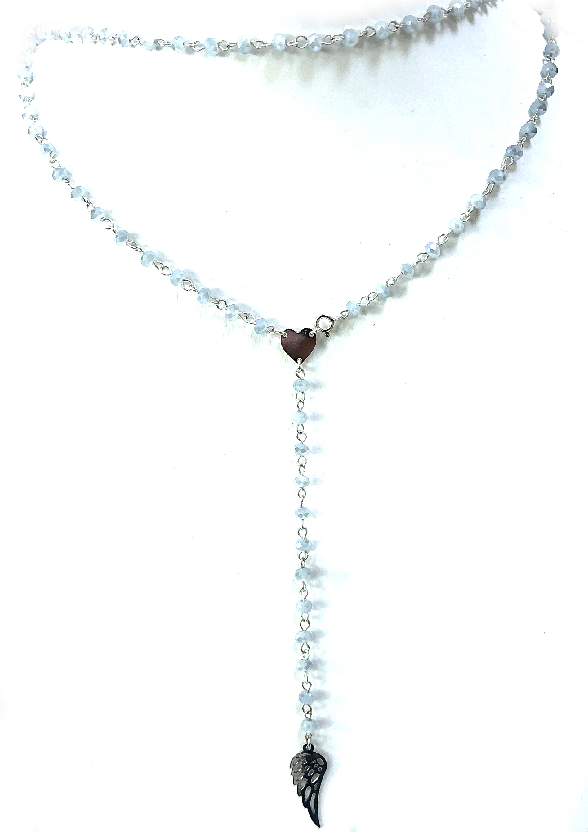 Srebrny naszyjnik z błękitnymi kryształkami. Naszyjnik ze srebrnym serduszkiem i skrzydłem.