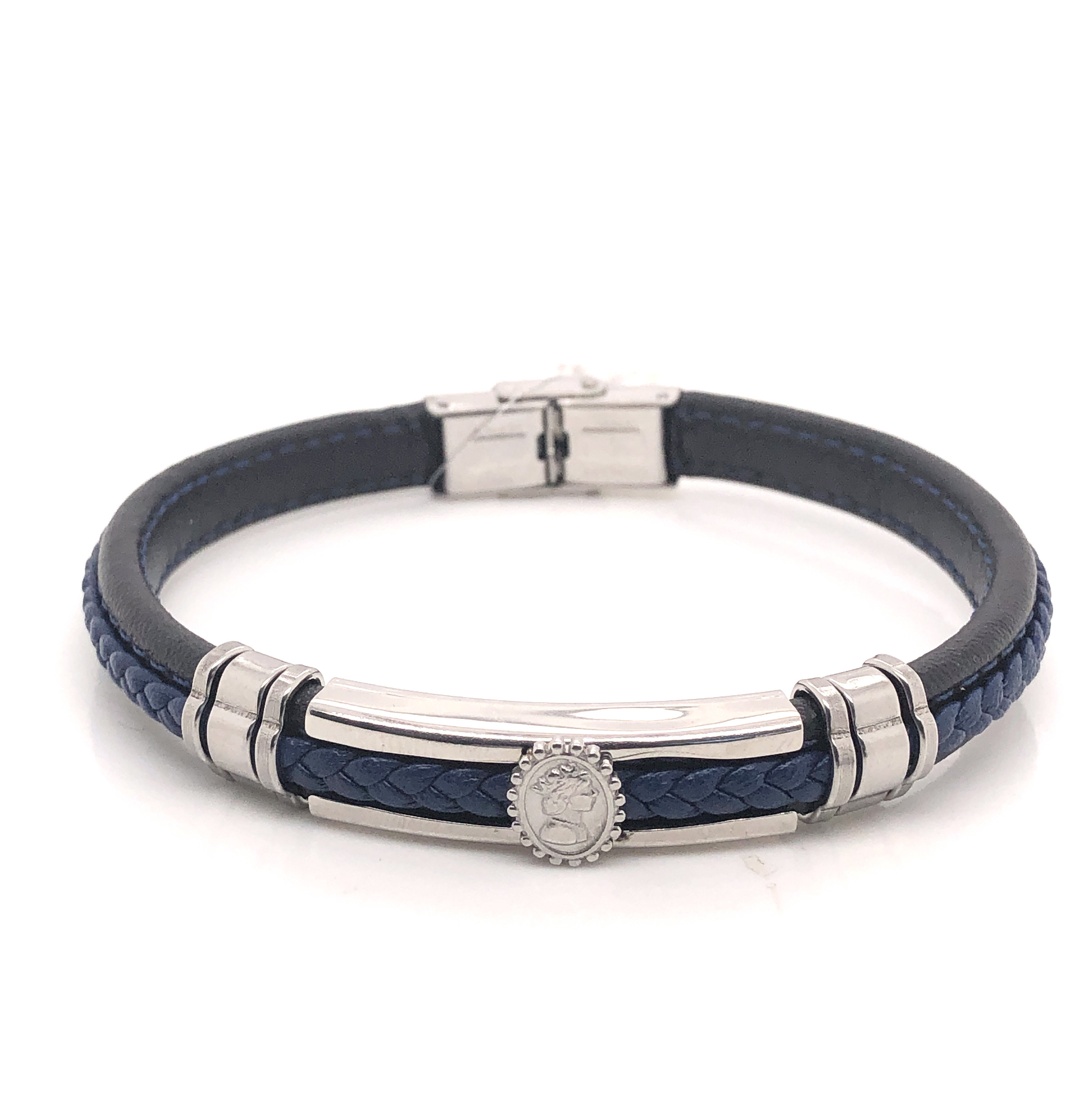 Bransoletka stalowa na skórzanym czarno-niebieskim pasku. Blaszka ozdobiona medalikiem.