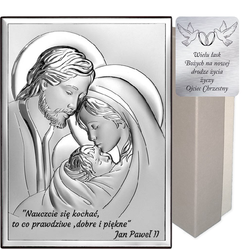 Obrazek Srebrny Święta Rodzina z wygrawerowanym cytatem Św. Jana Pawła II : Nauczcie się kochać to, co prawdziwe, dobre i piękne.