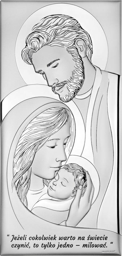 Ekskluzywny srebrny obrazek przedstawiający Świętą Rodzinę – Maryję, Józefa i Dzieciątko Jezus.Obrazek opatrzony jest pięknym cytatem: "Jeżeli cokolwiek warto na świecie czynić, to tylko jedno – miłować."