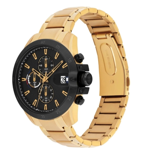 Tommy Hilfiger 1792199 – złoty zegarek męski Jameson 43 mm z czarną wielofunkcyjną tarczą, datownikiem i 5 ATM. Stylowy i solidny wybór na co dzień.