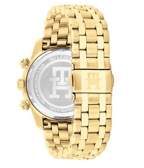 Tommy Hilfiger 1792158 to efektowny, męski zegarek typu diver‑inspired, który łączy sportową funkcjonalność z eleganckim wykończeniem. Koperta o średnicy 41 mm pokryta jest złotą powłoką, a granatowa tarcza z trzema subtarcza‑mi chronografu oraz dyskretnym datownikiem prezentuje się niezwykle stylowo. Solidna koperta i bransoleta wykonane ze stali nierdzewnej, mineralne szkło i wodoszczelność do 5 ATM gwarantują wytrzymałość i praktyczność w codziennym użytkowaniu. Mechanizm Seiko VR32 zapewnia precyzyjne odmierzanie czasu, a duże, wyraziste indeksy i wskazówki z powłoką luminescencyjną ułatwiają odczyt nawet w słabszym świetle. Idealne połączenie nowoczesnego designu i klasycznej jakości.
