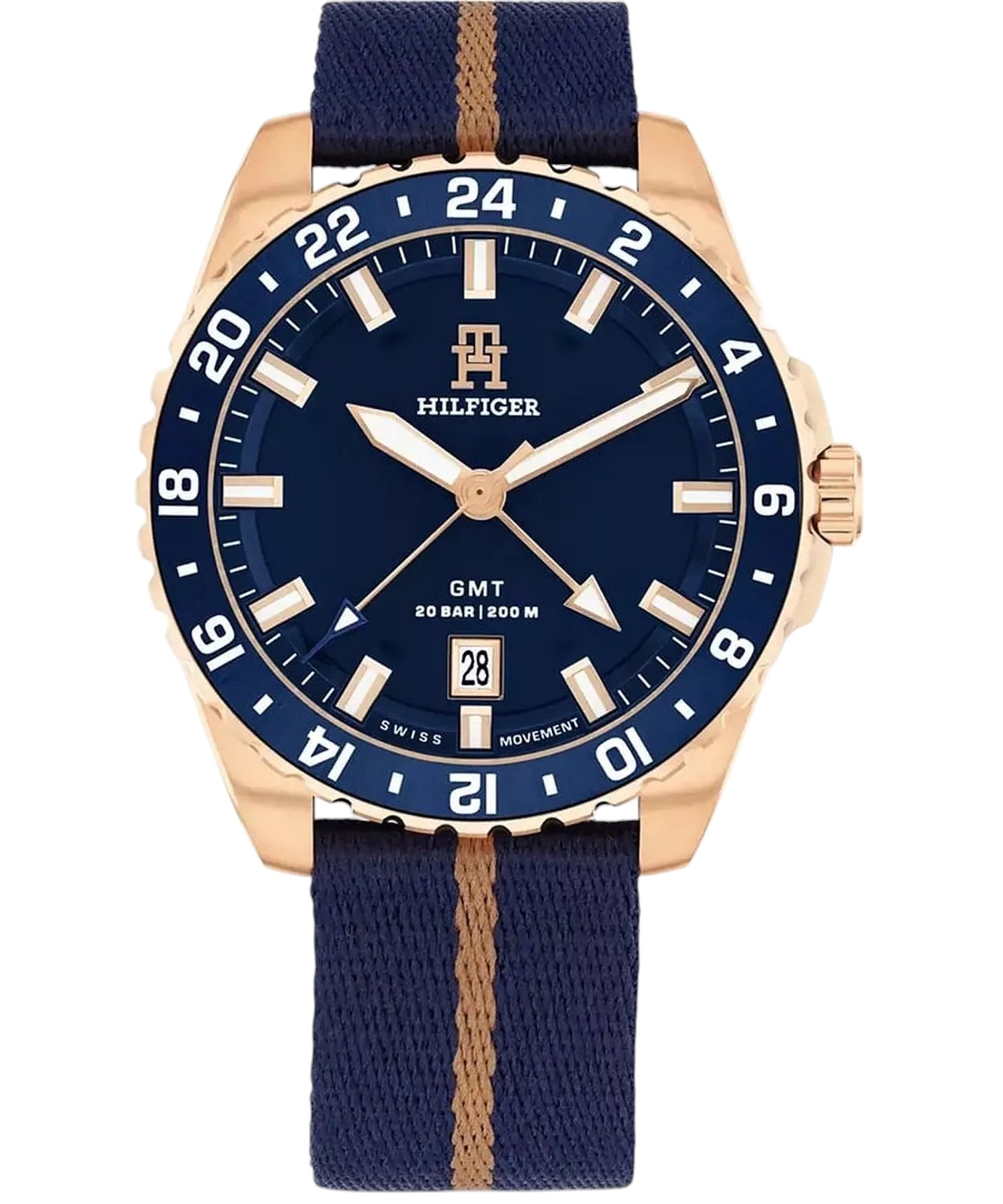 Tommy Hilfiger 1792130 to sportowy męski zegarek z granatową tarczą, złotą kopertą i materiałowym paskiem, wyposażony w funkcję GMT, datownik i wodoszczelność do 200 m.