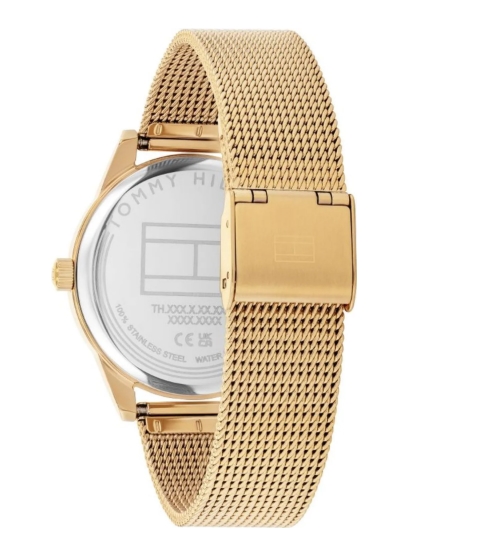 Tommy Hilfiger Camille 1782769 to stylowy damski zegarek o delikatnie kobiecym designie. Złota, stalowa koperta o średnicy 38 mm otacza różową tarczę z trójwskazówkowym układem uwzględniającym datownik, dzień tygodnia oraz wskaźnik 24h. Bransoleta typu mesh w tym samym złotym odcieniu tworzy spójną i elegancką całość. Model ten łączy minimalistyczną formę z funkcjonalnością – to propozycja idealna zarówno na co dzień, jak i na większe okazje.
