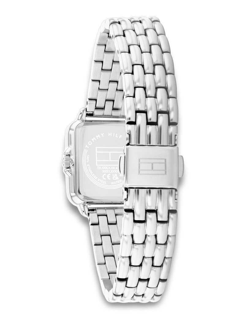Damski zegarek Tommy Hilfiger 1782830 to propozycja dla kobiet ceniących klasyczną elegancję w nowoczesnym wydaniu. Prostokątna koperta ze stali szlachetnej połączona została z bransoletą o polerowanym wykończeniu, co nadaje całości subtelnego szyku. Na srebrzystej tarczy umieszczono minimalistyczne indeksy oraz wskazówki w kolorze różowego złota, a całość uzupełnia charakterystyczne logo Tommy Hilfiger na godzinie trzeciej.