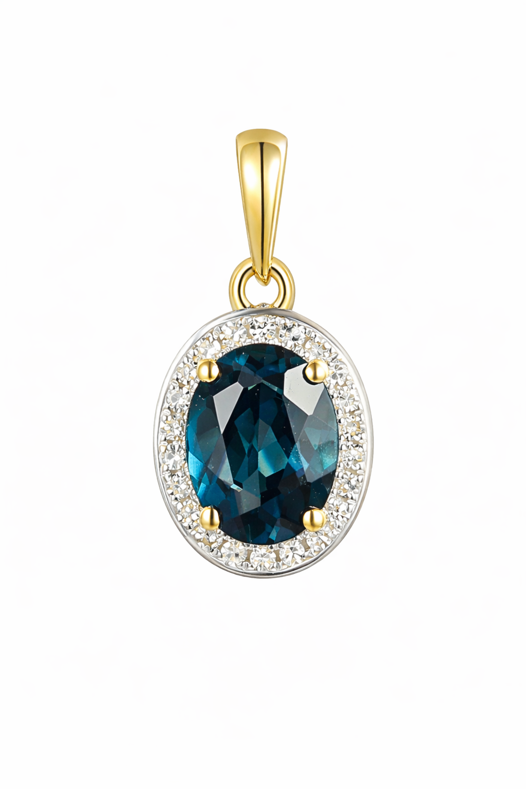 Elegancka zawieszka wykonana ze złota próby Au 585, ozdobiona naturalnym topazem London Blue o masie 0,96 ct. Centralny kamień otoczony jest lśniącymi diamentami o łącznej masie 0,07 ct w szlifie SCD, które podkreślają głęboką, szlachetną barwę topazu i n