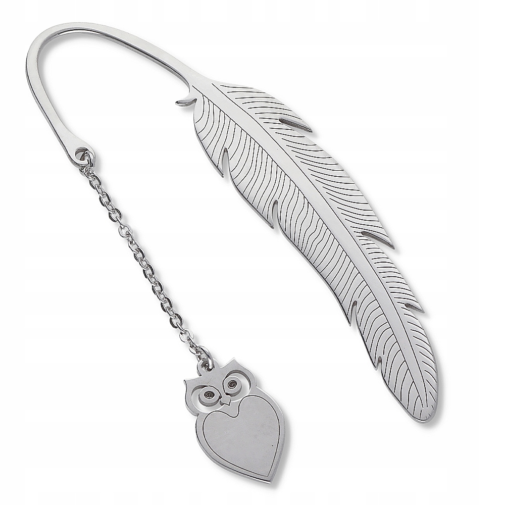 Elegancka zakładka do książki Ag 925 rodowana w kształcie pióra, ozdobiona zawieszką sowy – symbolem mądrości. Subtelne zdobienia i połysk rodowania nadają jej wyjątkowego charakteru.