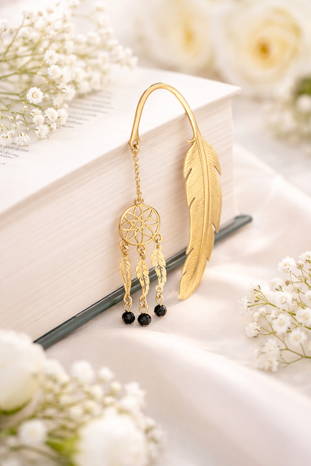 Wzór inspirowany motywem pióra oraz łapacza snów przyciąga uwagę subtelnymi detalami. Delikatne zawieszki zakończone połyskującymi cyrkoniami dodają całości lekkości i elegancji, pięknie odbijając światło przy każdym ruchu. Finezyjne zdobienia oraz staranne wykończenie sprawiają, że zakładka prezentuje się niezwykle efektownie zarówno w książce, jak i poza nią.