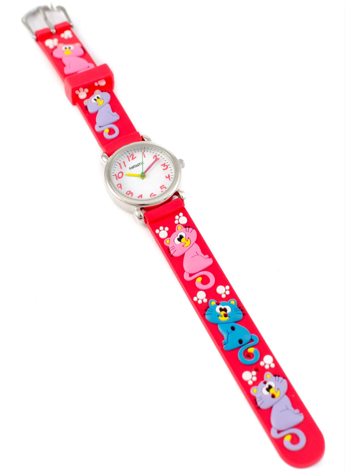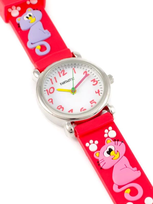 Zegarek kwarcowy dla dzieci marki FANTASTIC,z czerwonymi paskami ozdobionymi kolorowymi, uśmiechniętymi kotami. Tarcza zegarka jest klasyczna, z czytelnymi cyframi arabskimi na białym tle, co ułatwia odczytanie godziny. Idealne dla młodszych dzieci, dzięki zastosowaniu wesołemu i kolorowemu designowi, który zachęca do nauki zegarów.