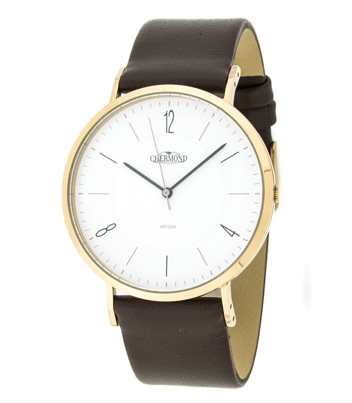 Zegarek męski Chermont model CQ245/STAL to elegancki czasomierz, który doskonale łączy klasyczny design z nowoczesnymi akcentami. Model ten posiada złotą, stalową kopertę, która pięknie kontrastuje z czysto białą tarczą.