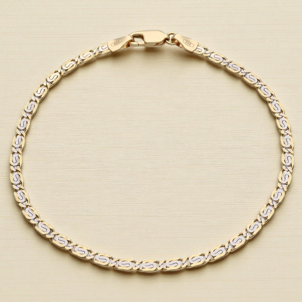 Elegancka bransoletka wykonana ze złota próby 585, wyróżniająca się dekoracyjnym, dwukolorowym wzorem. Połączenie żółtego i białego złota nadaje jej wyjątkowego charakteru oraz subtelnego, biżuteryjnego połysku. Delikatne, misternie wycięte ogniwa tworzą efektowną kompozycję, która pięknie prezentuje się na nadgarstku. To doskonały wybór dla osób ceniących oryginalne, a jednocześnie klasyczne dodatki ze szlachetnego kruszcu.