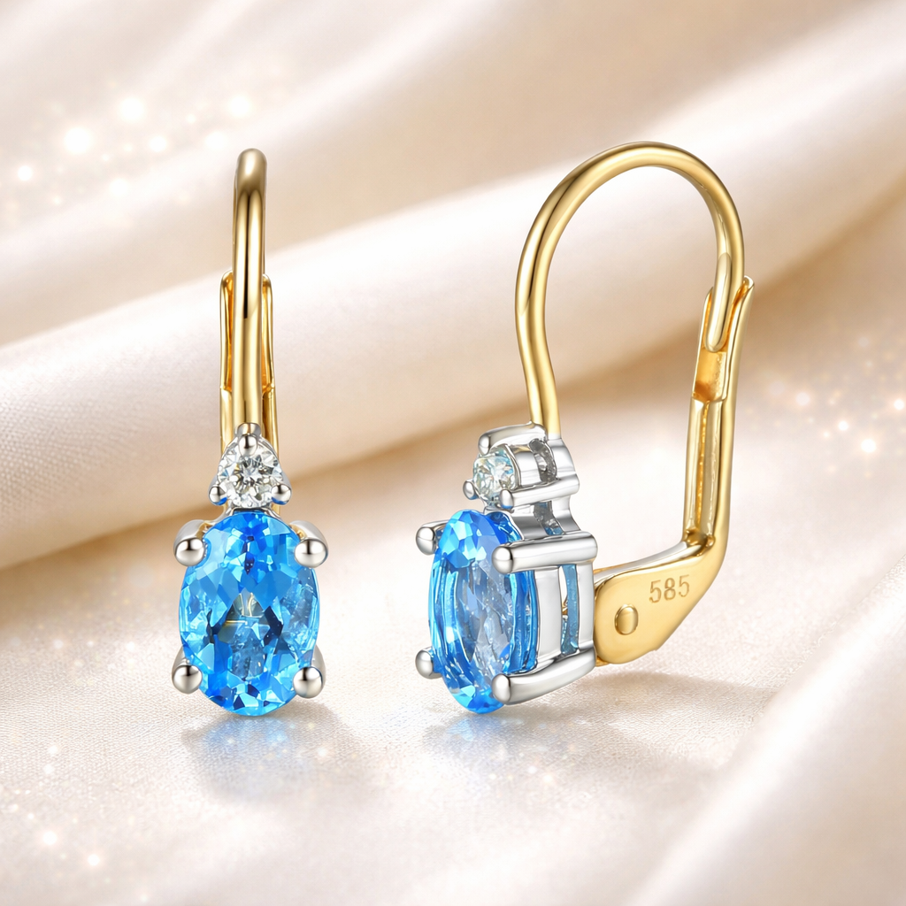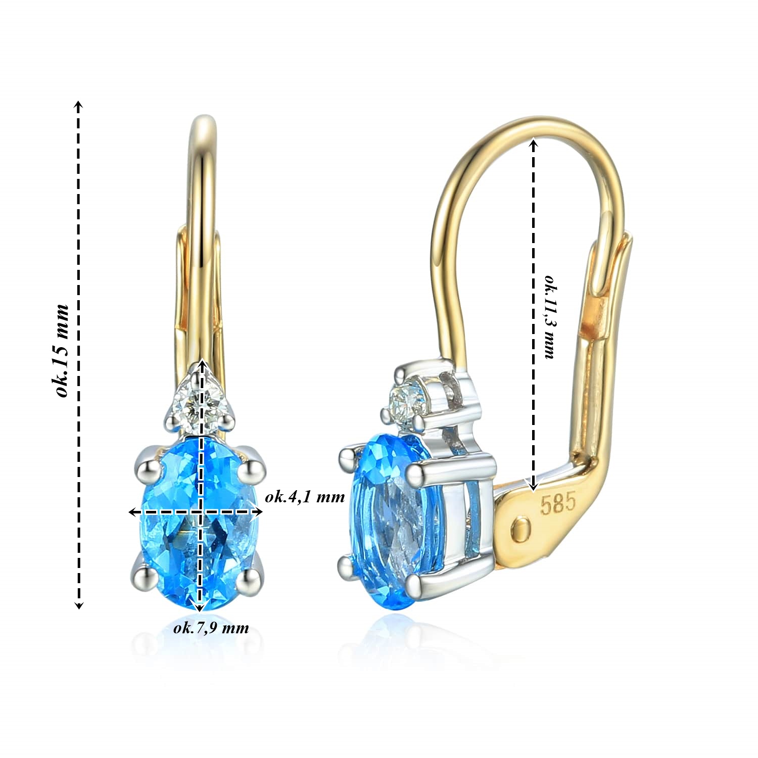 Kolczyki złote Au 585 z topazem London Blue i diamentami