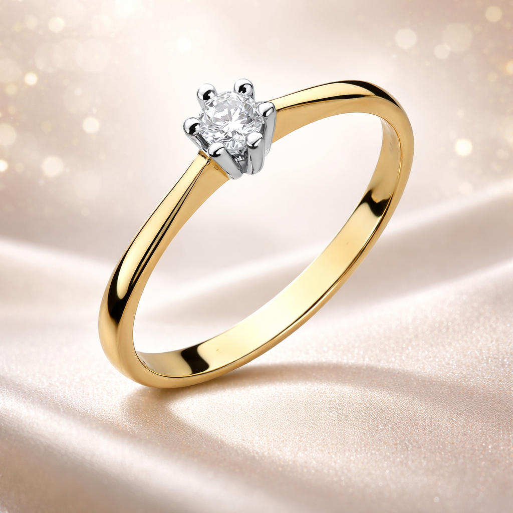 Klasyczny pierścionek z żółtego złota próby Au 585, ozdobiony diamentem o masie 0,15 ct w szlifie brylantowym. Kamień osadzony w eleganckiej koronie z białego złota, która podkreśla jego blask i wyjątkowy charakter.