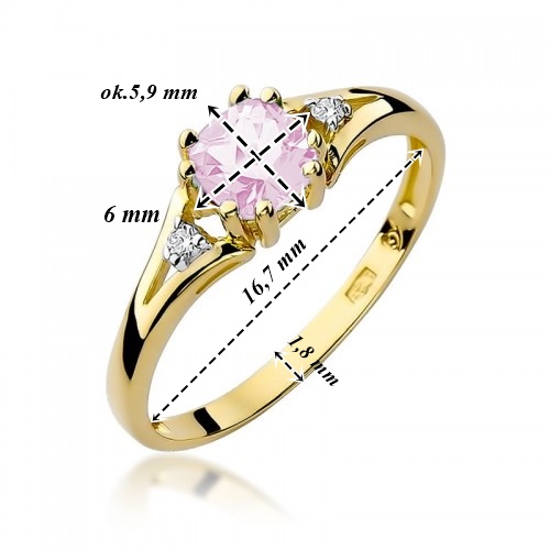 Złoty pierścionek Au 585 z różowym topazem i diamentami to elegancka i romantyczna propozycja dla wyjątkowej osoby. Delikatny kolor kamienia w połączeniu z błyskiem diamentów tworzy harmonijną całość. Idealny na zaręczyny lub prezent pełen uczuć.