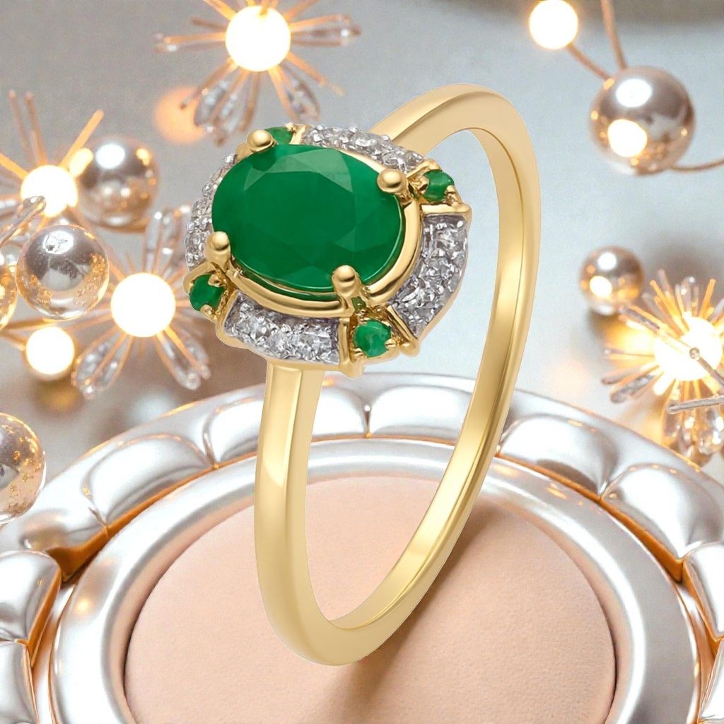 Złoty pierścionek Au 585 z naturalnym szmaragdem otoczonym diamentową oprawą. Klasyczna, luksusowa biżuteria, która zachwyca kolorem i blaskiem.