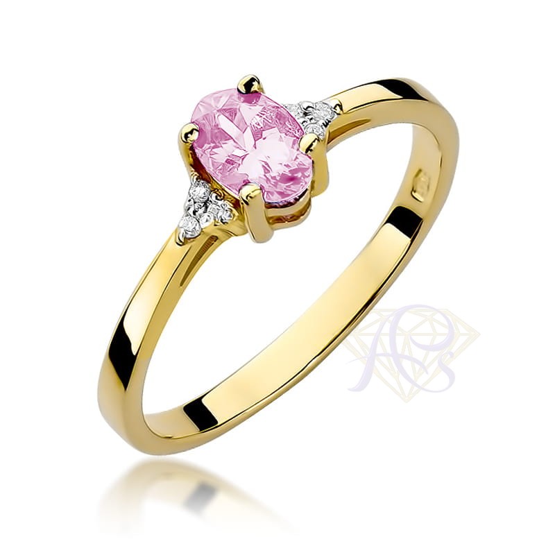 Pierścionek wykonany z żółtego złota próby 585 z centralnie osadzonym różowym Topazem. Całości dopełniają małe diamenciki.